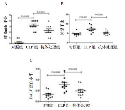 BALF蛋白水平测量结果提示,CLP组较对照组明显升高(t=4.331, P < 0.01),抗体处理组可见较CLP组有所下降(t=2.484, P=0.023),见图 2C