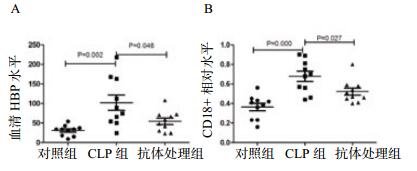 2.3 各组小鼠血清HBP和中性粒细胞CD18表达水平比较