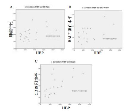A:HBP与肺干湿比; B:HBP与BALF蛋白水平; C:HBP与CD18阳性率 图 4 血清HBP与肺损伤相关指标的相关性分析 Figure 4 Correlation analyses of HBP and lung injury related index