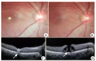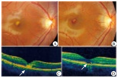 A:右眼伤后第2天,黄斑部见淡黄白色圆斑状病灶,视力0.2;B:伤后3个月,黄斑中心凹脱色素,伴颗粒状色素沉着,视力0.9;C:伤后第2天, OCT检查示黄斑中心凹处视网膜色素上皮层(RPE)与外丛状层之间出现圆形和放射状高反射病灶(箭头示);D:伤后3个月,OCT检查示黄斑中心凹处RPE、嵌合体带和椭圆体带缺失,伴小空腔形成(箭头示) 图 1 轻度激光笔性黄斑损伤的眼底和OCT表现