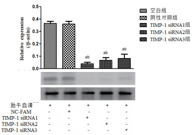 3对序列均可抑制TIMP-1蛋白表达,其中siRNA1序列对TIMP-1蛋白的抑制效果最佳,故选其进行后续实验,见图 1