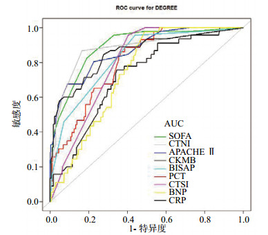 图 2 血CRP和PCT、CTSI评分、BISAP评分、APACHEⅡ评分、SOFA评分、proBNP、CK-MB和cTnI对SAP的预测效应汇总 Figure 2 The predictive ability of various indicators and score systems for SAP