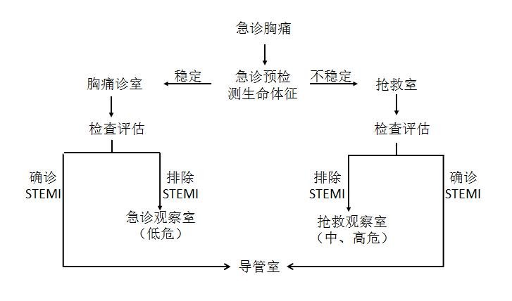 (1) 院前院内的无缝衔接。急诊科与院前急救科紧密相连,关系密切,容易沟通,尤其在县级区域基本是一体化建设。(2)流程。急诊科制订的院内流程更为合理,同时也为其他与时间窗紧密联系的疾病(如脑卒中、多发伤)提供了相似的绿色通道。(3)宣教与培训。对本区域的群众进行急救知识普及,建立上下级医院互动的社区医生培训和转诊体系,提高基层医生对胸痛、脑卒中等疾病早期诊断能力,这些都是急诊科职责所在。(4)鉴别诊断和留观。在所有胸痛患者人数中,STEMI和NSTEMI患者占比小于10%,故大量患者的鉴别诊断和动态观察均需在急诊科完成,对于不典型心梗的诊断基本依赖急诊医生的准确判断,故提高急诊科医护人员对胸痛诊疗的能力非常重要。