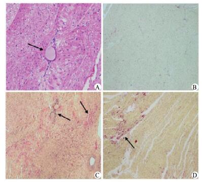 A:为CME组局部心肌微梗死灶HE染色,箭头示微球,×400;B~D:分别为Sham组,CME组,CME+尼可地尔组HBFP染色,缺血心肌红染,箭头示微梗死灶,HBFP染色,×200 图 1 HE和HBFP染色 Figure 1 HE and HBFP staining