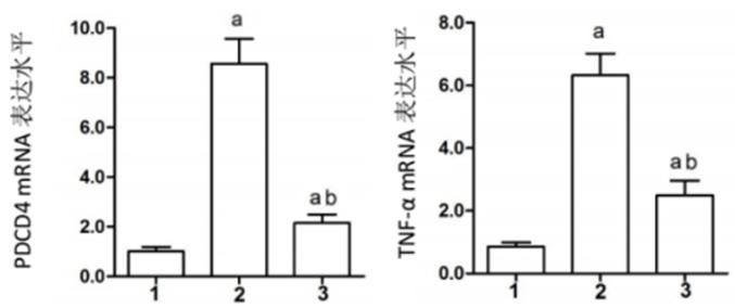2.4 各组PDCD4与TNF-α mRNA表达量的比较