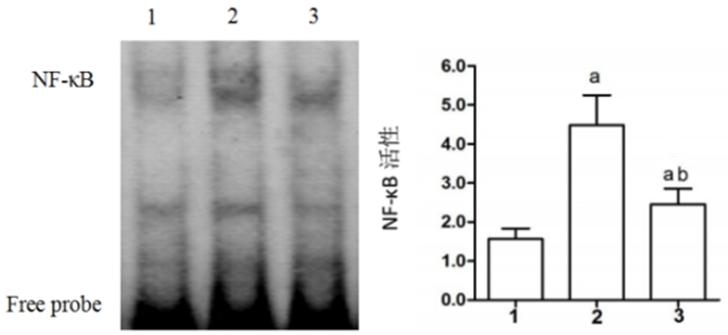 1:sham组,2:CME组,3:CME+尼可地尔组; 与Sham组相比较,aP < 0.05;与CME组相比较,bP < 0.05 图 4 EMSA检测NF-κB活性 Figure 4 EMSA detecting NF-κB activity