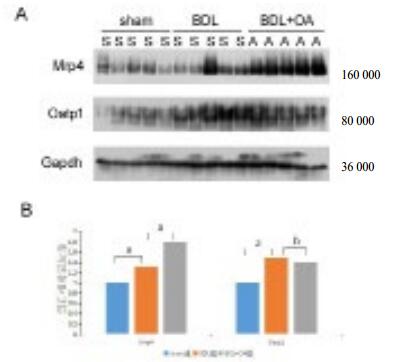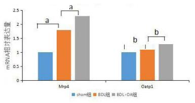 | sham组:假结扎组,BDL组:胆道结扎组,BDL+OA组:胆道结扎并灌胃齐墩果酸; aP < 0.05,bP > 0.05 图 1 Mrp4、Oatp1在mRNA水平的表达变化 Figure 1 the changes of Mrp4/Oatp1 in the mRNA level |