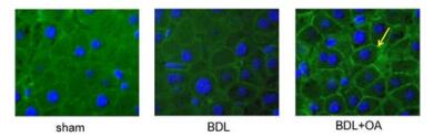 | sham:假结扎组,BDL:胆道结扎组,BDL+OA:胆道结扎并灌胃齐墩果酸,黄色箭头所指即为Mrp4 图 3 Mrp4免疫荧光结果 Figure 3 The results of Mrp4 in different groups, testing by immunofluorescence |