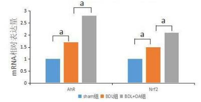 | sham组:假结扎组,BDL组:胆道结扎组,BDL+OA组:胆道结扎并灌胃齐墩果酸aP < 0.05 图 4 AhR、Nrf2在mRNA水平的表达变化 Figure 4 The changes of Ahr/Nrf2 in the mRNA level |