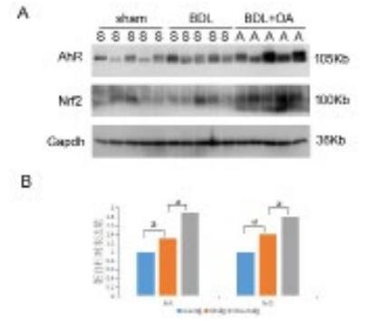RT-qPCR结果显示:与sham组相比较,BDL组和BDL+OA组肝脏组织核受体AhR、Nrf2表达均上调,其中AhR在BDL组表达增高1.7倍,在BDL+OA组表达增高2.8倍,Nrf2在BDL组表达增高1.5倍,在BDL+OA组表达增高2.1倍,P < 0.05,差异具有统计学意义(图 4)。蛋白免疫印迹结果显示:无论在BDL组还是BDL+OA组,AhR、Nrf2表达均增高,其中在BDL组,AhR表达增高1.3倍,Nrf2表达增高1.4倍; 在BDL+OA组AhR表达增高1.9倍,Nrf2表达增高1.8倍,差异具有计学意义(图 5)。