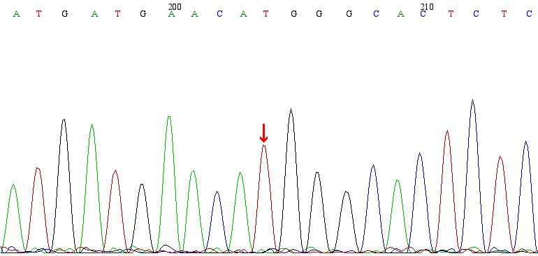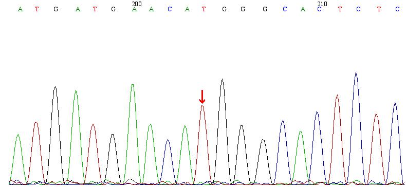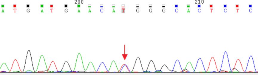 | 图 3 患者母亲SLC22A12基因携带一个c.650C>T(p.Thr217Met)杂合突变 |