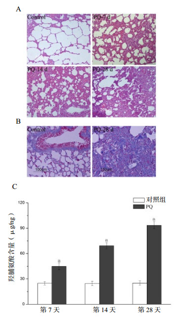 如图 2A所示,对照组的肺组织表现正常,未出现炎症或上皮损伤的迹象。而PQ处理后肺组织发生明显的结构改变。PQ处理7 d后,肺部组织出现急性损伤的征象,包括间质水肿和肺泡腔和肺泡间隔广泛的炎症细胞浸润。14 d后,可观察到明显的单核炎症细胞浸润,成纤维细胞增殖,广泛的细胞增厚和纤维化。而在第28天,HE染色显示增厚的肺泡壁和肺间质纤维化。Masson染色显示PQ组的胶原蛋白沉积(蓝色)与对照组相比增加(图 2B)。总之,组织病理学证据表明PQ给药可致大鼠肺损伤和肺纤维化。