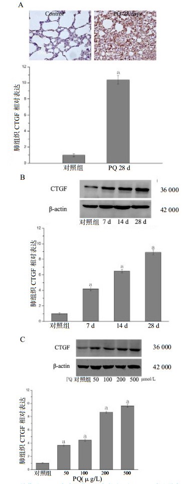 | A:PQ给药后28 d,免疫组化显示大鼠肺组织CTGF表达增多;B:PQ暴露后7、14和28 d,Western-blot显示大鼠肺组织CTGF的表达增加,具有时间依赖性;C:Western-blot显示MRC-5细胞暴露于PQ(50、100、200和500 μmol/L)后CTGF的表达增加;数据用均数±标准差(x±s)表示;与对照组(n=6)相比,aP < 0.01 图 3 大鼠肺和MRC-5人肺成纤维细胞中PQ诱导的CTGF表达 Figure 3 PQ-induced CTGF expression in rat lungs and MRC-5 human lung fibroblasts |