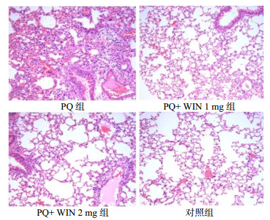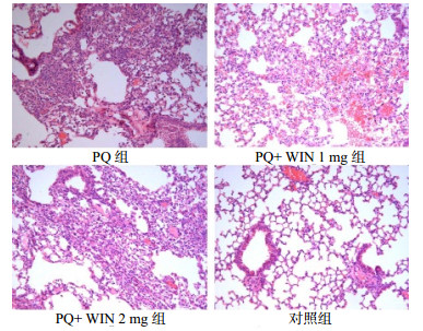 急性期:PQ组肺淤血严重,灶性出血,肺组织正常结构消失,大量炎细胞(以中性粒细胞为主)浸润,WIN 1 mg组急性炎症表现较PQ组减轻,少量炎症细胞(以中性粒细胞和单核细胞为主)浸润,WIN 2 mg组也表现为急性炎症,肺泡充血明显,对照组为正常肺组织,见图 1。慢性期:PQ组小鼠可见明显慢性炎症伴纤维化,WIN 1 mg组纤维化表现较PQ组减轻,WIN 2 mg组小鼠慢性纤维化表现,纤维化程度略重于WIN 1 mg组,对照组呈正常肺组织形态,见图 2