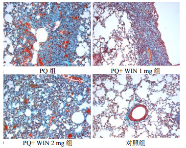 28 d慢性期取各组小鼠肺组织行Masson染色。PQ组可见肺泡组织破坏伴大量绿色胶原沉积;WIN 1 mg组散在浅绿色胶原组织,纤维化程度较PQ组轻,WIN 2 mg组表现为散布深绿色胶原。对照组肺泡结构清晰,无胶原沉积,见图 3