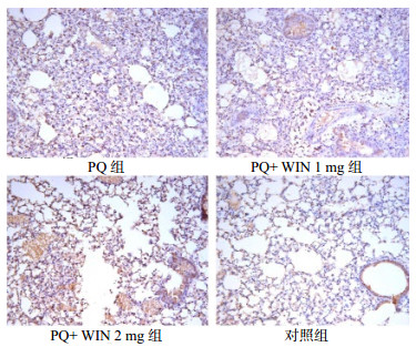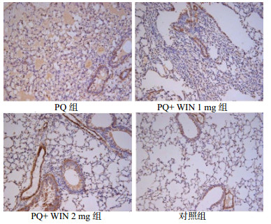 PQ组可见支气管平滑肌、肺泡间质内有阳性染色,WIN 1 mg组肺泡结构相对完整,肺泡间质内有少量表达,WIN 2 mg组在肺泡间质和支气管上皮也有散在表达。对照组小鼠小血管和支气管平滑肌细胞处有α-SMA表达,见图 5