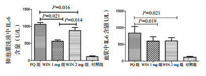 ① IL-6 (肺泡灌洗液):PQ组、WIN 1 mg组、WIN 2 mg组、对照组BALF中IL-6水平(U/L)分别为1 024.77±124.74、620.48±99.76、823.29±157.88、180.42±20.22;予WIN55212-2干预后,WIN 1 mg组和WIN 2 mg组IL-6水平均较PQ组下降,且差异有统计学意义(P=0.021,P=0.016)。但两干预组间差异无统计学意义(P=0.114),见图 6