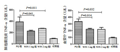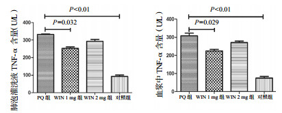 ② TNF-α(血浆):PQ组、WIN 1 mg组、WIN 2 mg组、对照组血浆中TNF-α水平(U/L)分别为308.23±19.14、216.32±10.72、267.78±10.24、90.16±14.63。组间比较,WIN 1 mg组水平显著低于PQ组(P=0.029),WIN 2 mg组与PQ组差异无统计学意义(P=0.332),见图 8