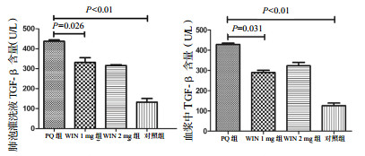 ③ TGF-β(肺泡灌洗液):PQ组、WIN 1 mg组、WIN 2 mg组、对照组BALF中TGF-β水平(U/L)分别为424.04±6.14、326.27±21.25、303.93±10.59、118.80±14.41。组间比较,WIN 1 mg组水平显著低于PQ组(P=0.026),但WIN 1 mg组与WIN 2 mg组差异无统计学意义(P=0.349),见图 9