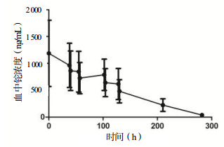患者8,女性42岁。出现腹痛、脱发、意识障碍等症状后44 d才在我院确诊铊中毒,来院时处于深昏迷状态,呼吸机辅助呼吸,血铊为950 ng/mL。入院后胃管注入普鲁士蓝胶囊同时给予血浆置换4次(图 2),血浆置换时间为入院第一次毒检后7、32、56和85 h,每次持续1 h。4次置换液中铊浓度分别为80、50、50及40 ng/mL。表明血浆置换也可快速排出患者体内的铊。并于133 h及277 h(即入院后12 d)再次复查毒检。最后一次血、尿中均未查到毒物。