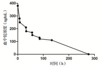 患者4~7为一家人,同时中毒。因四人病情较重,血铊含量高,口服普鲁士蓝胶囊同时给予血液灌流治疗。血液灌流时间为入院第一次毒检后38、55,102和128 h,每次持续2 h。并于210、282及354 h(即入院后15 d)再次复查毒检。最后一次血、尿中均未查到毒物(图 1)。从图中看到每次血液灌流均可快速降低血中铊浓度。