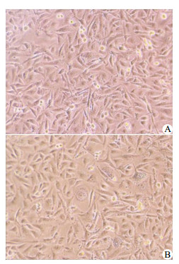 | A:正常人脐静脉血管内皮细胞;B:HMGB1(100 ng/mL)刺激24 h后人脐静脉血管内皮细胞 图 1 脐静脉血管内皮细胞形态(×200) Figure 1 Human umbilical endothelial cells (×200) |