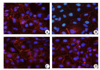 | A:空白对照组,B:rhHMGB1处理组,C:普通肝素处理组,D:普通肝素+rhHMGB1处理 图 2 免疫荧光法测定紧密连接蛋白Claudin-5表达和分布(IF×400) Figure 2 The expression and distribution of tight junction protein Claudin-5 detected by immunofluorescence (IF×400) |