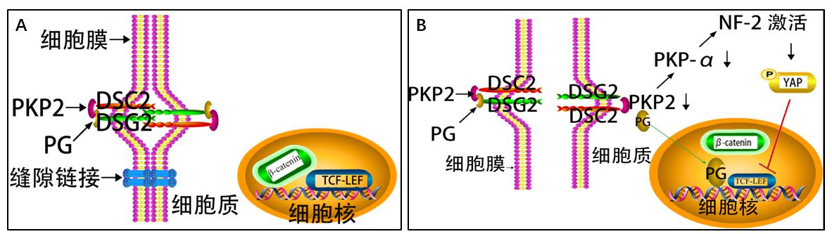 桥粒是一种常见的细胞连接结构,连同筋膜连接和缝隙连接而位于闰盘内,共同连接心肌细胞,使心脏的机械活动和电功能同步。编码桥粒蛋白的基因发生突变在ARVC的发病机制中起着关键作用,近50%的ARVC患者携带有突变的桥粒蛋白基因,如PKP2(plakophilin 2,斑菲素蛋白-2,12p11.21)、DSG2(desmoglein 2,桥粒芯糖蛋白-2,18q12.1)、DSC2(desmocollin 2,桥粒胶蛋白-2,18q12.1)、DSP(desmoplakin,桥粒斑蛋白,6p24.3)以及JUP(PG,junction plakoglobulin,盘状球蛋白,17q21.2)等基因发生突变[8]。因此,该病也被称为桥粒蛋白病。近年来,人们对分子遗传学进行了大量研究,普遍认为除心肌桥粒蛋白基因外,非桥粒蛋白基因的突变也参与了ARVC的发生过程,如DES(desmin,肌间线蛋白)[9]、RYR2(ryanodine receptor 2,利阿诺定受体-2)[10]、TMEM43(transmembrane protein 43,跨膜蛋白-43)[11]以及TGF-β3(transforming growth factor β3,转化生长因子-β3)[12]等基因的突变也被认为可能与ARVC发生有关。