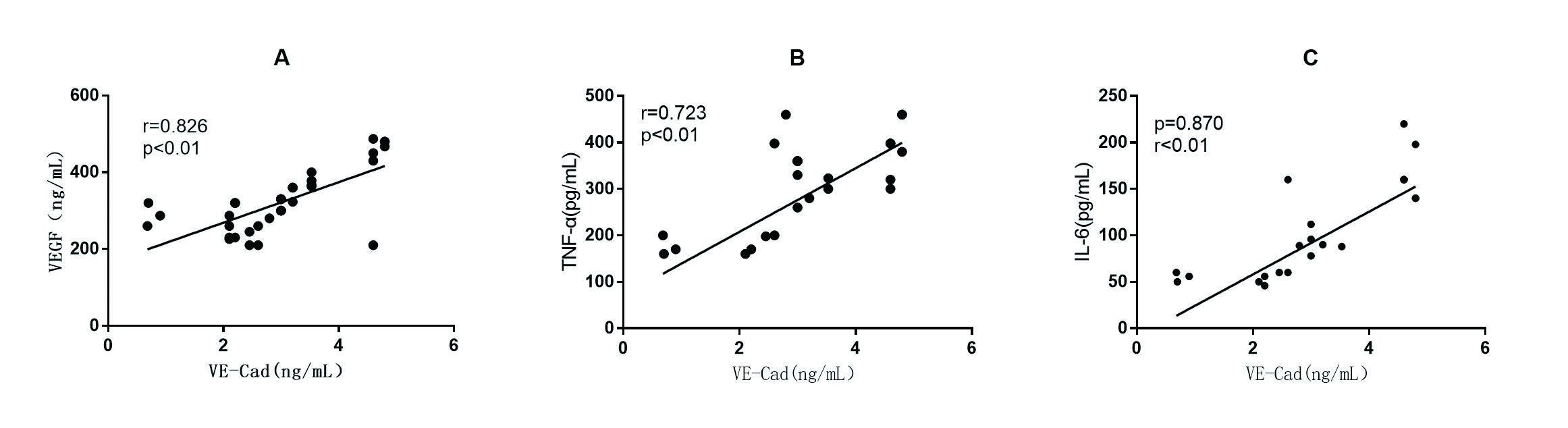 本研究发现,血清VE-Cad与VEGF、TNF-α和IL-6均正相关(r分别为0.826、0.723和0.870,均P < 0.01)。见图 1。