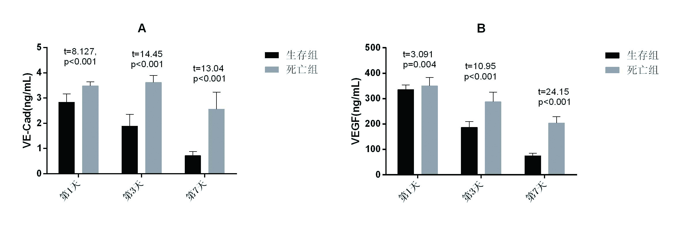 1.2 研究方法记录患者姓名、性别、年龄、原发疾病、住院时间和转归。根据当日最差指标评定急性生理学及慢性健康状况Ⅱ (APACHEⅡ)评分及序贯器官功能衰竭评分(SOFA)。观察入院第1、3、7天血清VE-Cad、血管内皮生长因子(VEGF)、肿瘤坏死因子-α(TNF-α)和白介素-6(IL-6)水平变化。