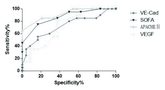 | 图 4 VE-Cad与VEGF、APACHEⅡ评分和SOFA判断脓毒症预后的ROC分析 Figure 4 ROC analysis of VE-Cad, VEGF, APACHEⅡand SOFA in predicting sepsis outcome |