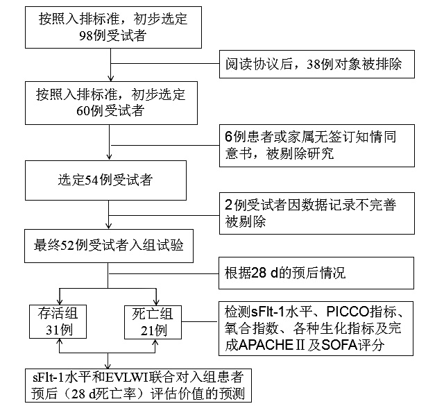 重症肺炎是呼吸重症监护室常见的急危重症,极易引起急性呼吸窘迫综合征(ARDS)[1],一旦进展为ARDS,其呼吸窘迫、进行性低氧血症和呼吸衰竭更为严重。重症肺炎ARDS患者常合并感染性休克,病死率可达50%以上;及早了解血容量状态,精准控制液体量[2],并寻求简单快速的生物学指标进行预后预测,尽早进行干预措施和治疗方案的调整,对患者至关重要。Yang等[3]报道血清sFlt-1对脓毒症的诊断有一定的价值,笔者的研究已经证实血清sFlt-1可以预测重症肺炎患者28 d的病死率[4]。脉搏指示连续心排出量(PICCO)能精确连续监测心排量、血流动力学及EVLWI的变化,对感染性休克患者能起到很好的指导作用[5]。考虑到sFlt-1对重症肺炎的预后价值以及PICCO对感染性休克的指导价值,本研究回顾性分析探讨EVLWI联合sFlt-1在PICCO监测指导下对重症肺炎ARDS合并感染性休克患者的预后评估作用。