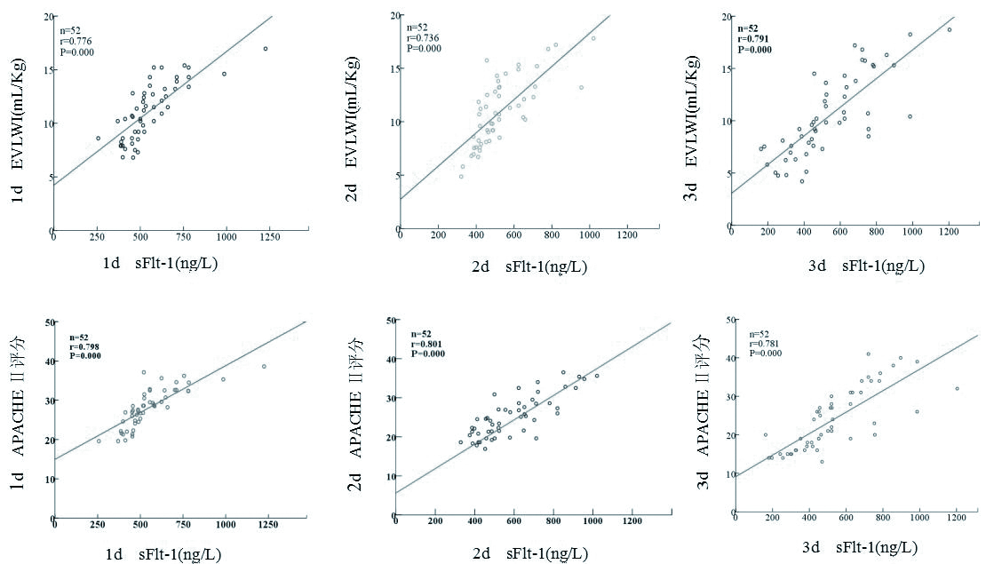 重症肺炎ARDS合并感染性休克患者在入住RICU治疗1、2、3 d时的sFlt-1水平分别与EVLWI及APACHEⅡ评分均显著相关(P均 < 0.01),见图 2