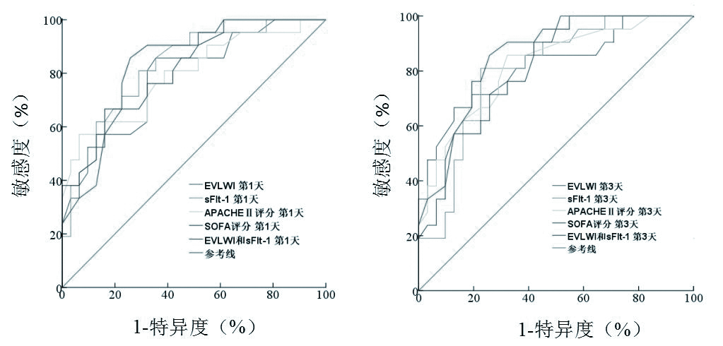 入住RICU第1、3天时,sFlt-1联合EVLWI预后评估的敏感度和特异度分别为89.7%,78.2%和86.3%,75.7%,AUC分别为0.875和0.856(P均 < 0.01),分别大于同期其他指标的AUC,见表 5图 3