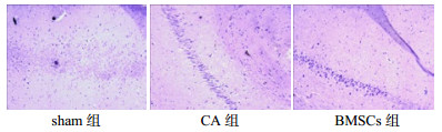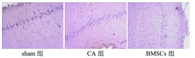 2 结果 2.1 改良神经功能缺损评分(mNSS)复苏后第1、3天,CA组、BMSCs组mNSS得分较假手术组均有明显升高(均P < 0.05); 在相同时间点,BMSCs组得分均低于CA组(均P < 0.05)。复苏后第7天,BMSCs组得分低于CA组(P < 0.05)。见表 1。