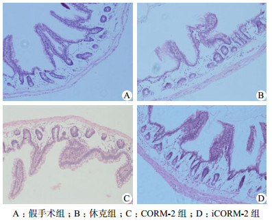 图 1所示,假手术组大鼠回肠黏膜固有层腺体细胞结构清晰,黏膜上皮完整,绒毛细胞排列整齐; 休克组大鼠回肠绒毛排列紊乱,绒毛表面明显游离,肠上皮细胞出现大量坏死,结构不连续,破坏明显; CORM-2组回肠上皮细胞少量坏死,绒毛部分节段结构不连续,未见明显水肿,较休克组显著改善; iCORM-2组肠黏膜上皮亦有大量坏死,绒毛水肿。与假手术组比较,其余各组Chiu评分升高,CORM-2组评分低于休克组和iCORM-2组,见表 1