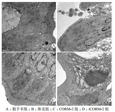 图 2所示,透射电镜下可见假手术组肠黏膜上皮排列规则、紧密,上皮细胞表面微绒毛丰富,杯状细胞分泌旺盛,线粒体内质网结构正常,细胞间紧密连接紧密; 休克组肠黏膜上皮排列紧密,上皮表面微绒毛略稀疏,部分微绒毛倒伏,杯状细胞形态全无,呈空泡状,部分细胞线粒体肿胀,基质变淡,嵴变短,内质网缺失,上皮细胞紧密连接增宽。CORM-2组上皮细胞表面微绒毛较假手术组稀疏,较休克组上皮微绒毛倒伏减轻,线粒体、内质网结构保存较好。iCORM-2组肠上皮细胞微绒毛水肿,线粒体、内质网水肿、结构破坏明显。