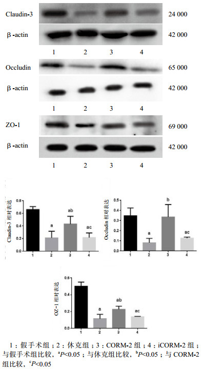 图 3可见,与假手术组比较,休克组、iCORM-2组Claudin3、Occludin、ZO-1蛋白表达均降低(均P < 0.05)。CORM-2组仅Claudin3、ZO-1表达水平低于假手术组(均P < 0.05),Occludin蛋白表达与假手术组差异无统计学意义(P>0.05)。且CORM-2组上述蛋白表达均高于休克组及iCORM-2组(均P < 0.05),后两组之间上述蛋白表达差异无统计学意义(均P>0.05)。