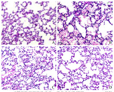 A:对照组肺组织结构完整,无炎症细胞浸润;B:HO3d组肺泡腔大量出血,肺间质水肿,伴大量炎症细胞浸润,肺组织结构破坏;C:HO3d+Carba组肺泡腔少量出血,肺间质轻度水肿,少量炎症细胞浸润;D:Carba组肺组织结构无明显异常损伤 图 2 光镜下HE染色的各组肺组织切片(×400) Figure 2 HE staining of lung tissue sections of each group under light microscope (×400)