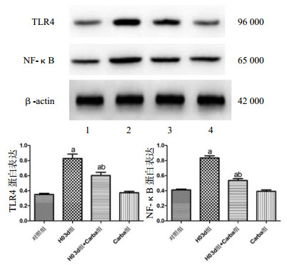 1:对照组;2:HO3d组;3:HO3d组+Carba组;4:Carba组; 与对照组比较,aP < 0.01;与HO3d组比较,bP < 0.01 图 3 Western blot检测各组小鼠肺组织TLR4、NF-κB p65蛋白的表达结果 Figure 3 Western blot analysis of TLR4 and NF-κB p65 protein expression in lung tissues of mice