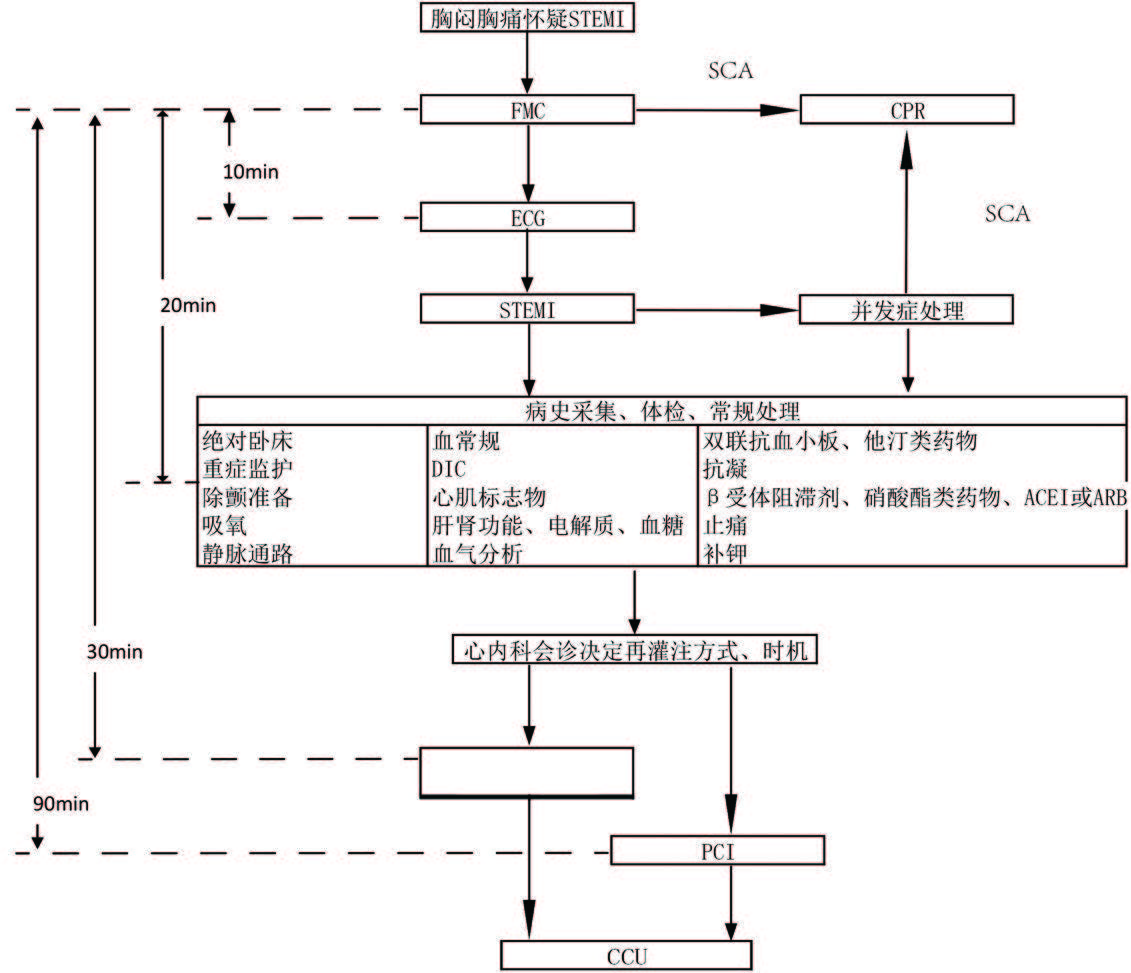 FMC,首次医疗接触;SCA,心脏骤停;CPR,心肺复苏;ECG,心电图;PCI,经皮冠脉介入;CCU,心血管科重症监护病房 图 1 急诊STEMI诊疗流程