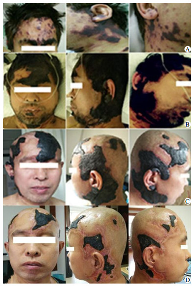 | A:患者发病初皮损情况;B:患者就诊时皮损情况;C:患者住院30 d皮损情况;D:患者发病60 d(出院20 d)皮损情况 图 1 患者发病后的皮损改变 |