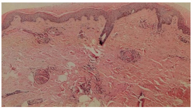 | 图 2 本例患者左小腿坏死组织病理(HE×40) |