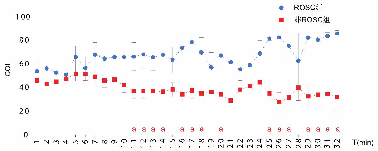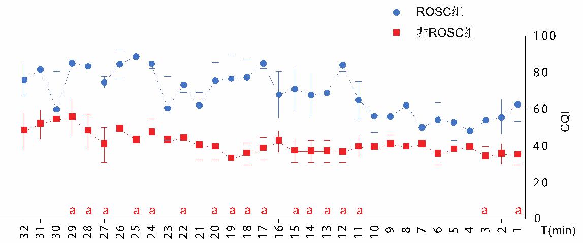 两组间参数差异有统计学意义,aP < 0.05 图 2 复苏停止前,ROSC组与非ROSC组间CQI不同时间点比较 Fig 2 CQI differences between ROSC group and non-ROSC group before CPR was stopped