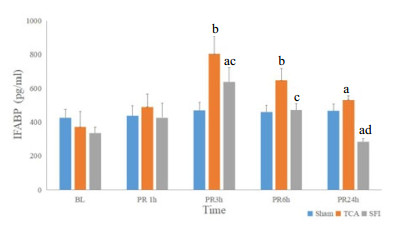 IFABP,肠脂肪酸结合蛋白;BL,基线值;PR,复苏后;Sham,假手术组;TCA,创伤性心脏骤停组;SFI,参附组。与同时点Sham组相比,aP < 0.05,bP < 0.01;与同时点TCA组相比,cP < 0.05,dP < 0.01 图 1 三组动物复苏前后IFABP的变化比较