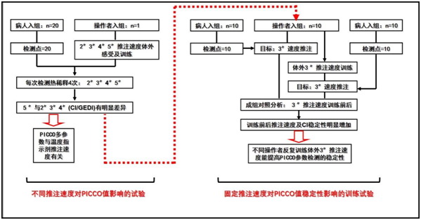 本研究计划通过对温度指示剂不同推注速度的阶梯分析,进一步证实温度指示剂的注射速度差异可能导致部分容量指标检测的失真的推测;同时尝试对操作者进行统一推注速度的体验和训练以达到尽可能降低PICCO检测误差的目的,为推出一套PICCO标准化操作的培训方案提供重要技术参数及理论支持。