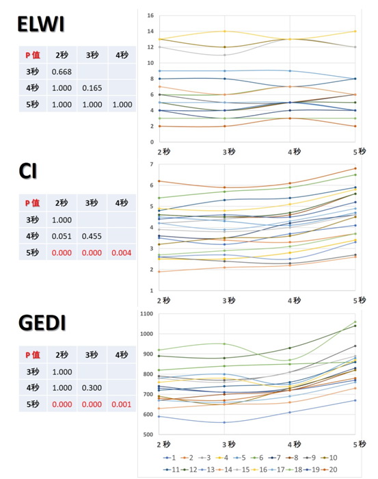右图中分别以20种不同颜色的曲线代表 20位独立患者分别在不同推注速度测试下获得的ELWI、CI、GEDI的变化趋势;左图为对2、3、4、5 s四种不同速度推注获得的ELWI、CI、GEDI值进行两两比较,P < 0.05(红色)为差异有统计学意义 图 2 分别以2、3、4、5 s的速度推注温度指示剂对ELWI、CI、GEDI等PICCO检测值的影响
