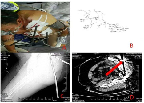 患者男,39岁,于2017年9月23日在建筑工地作业时不慎从7 m高处坠落,致全身被多根钢筋贯通伤,伤后即感全身疼痛,呼吸困难,神志清楚,经消防人员初步处理后由我院院前人员给予初级创伤救治,通知院内启动应急预案系统。入院后查体血压88/60 mmHg(1 mmHg=0.133 kPa),脉搏110次/min,R 20次/min,血氧饱和度95%,神清,面色及睑结膜苍白,强迫左侧卧位,可见1根钢筋(长约50 cm)自左肩胛区左前胸部,三根钢筋分别自左臀部至左肩部贯通,右臀部至上腹部贯通,左腰部贯通左上腹(图 1),伤口出血不止,呼吸活动左右不一致,左肺呼吸音减弱,右肺呼吸音清晰,四肢活动尚可,腹部压痛及反跳痛查体不配合。实验室检查WBC 12.66 ×109/L;其余化验结果均正常。腹部B超示:①右肝、胰腺显示不清;②脾周少量积液,深约1.2 cm,因伤者身上横着钢筋,无法以正常体位CT扫描,初步诊断为“胸腹部钢筋贯通伤;创伤性休克”。患者影像学资料见图 1