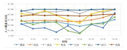 从南山区一天内各个街道服务人口百分比变化来看(图 5~6),覆盖人口百分比变化最剧烈的时段正好是城市晚高峰,无论是10 min还是15 min服务覆盖范围内,沙河街道的变化幅度都最大,说明沙河街道院前急救资源的覆盖人口受交通路况的影响十分大。院前急救资源10 min服务覆盖范围内,南山街道和粤海街道的变化幅度也较大;15 min服务覆盖范围内,南山街道和桃园街道的变化幅度较大。蛇口街道、招商街道则受交通路况的影响较小。