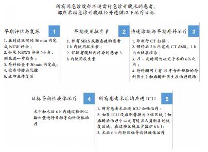 Huddart等[23]通过对行急诊开腹术的患者应用一种有循证依据的治疗路径(图 1)后发现患者的病死率显著下降。